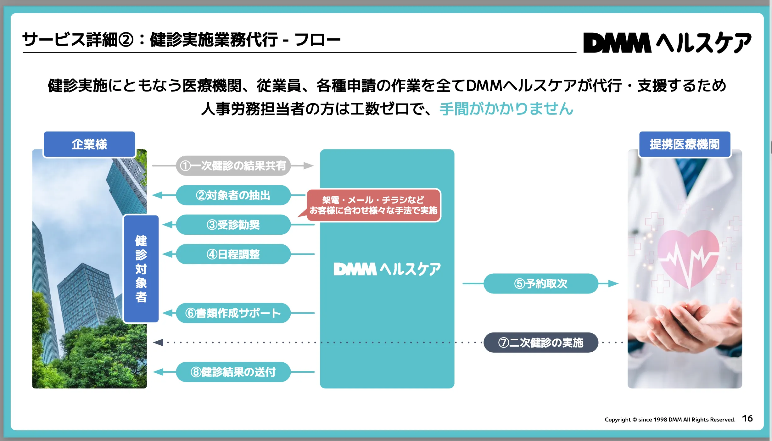糟谷さん:初めての取り組みには不安がつきものです。その点、DMMさんはこちらが気になる点をすぐに解消してくれましたし、何より「手間がかからない」というメリットは想像以上に大きいです。受診率が伸び悩んでいる、あるいは従業員へのアプローチに限界を感じているのであれば、私はDMMのこのサービスをぜひお勧めしたいです。