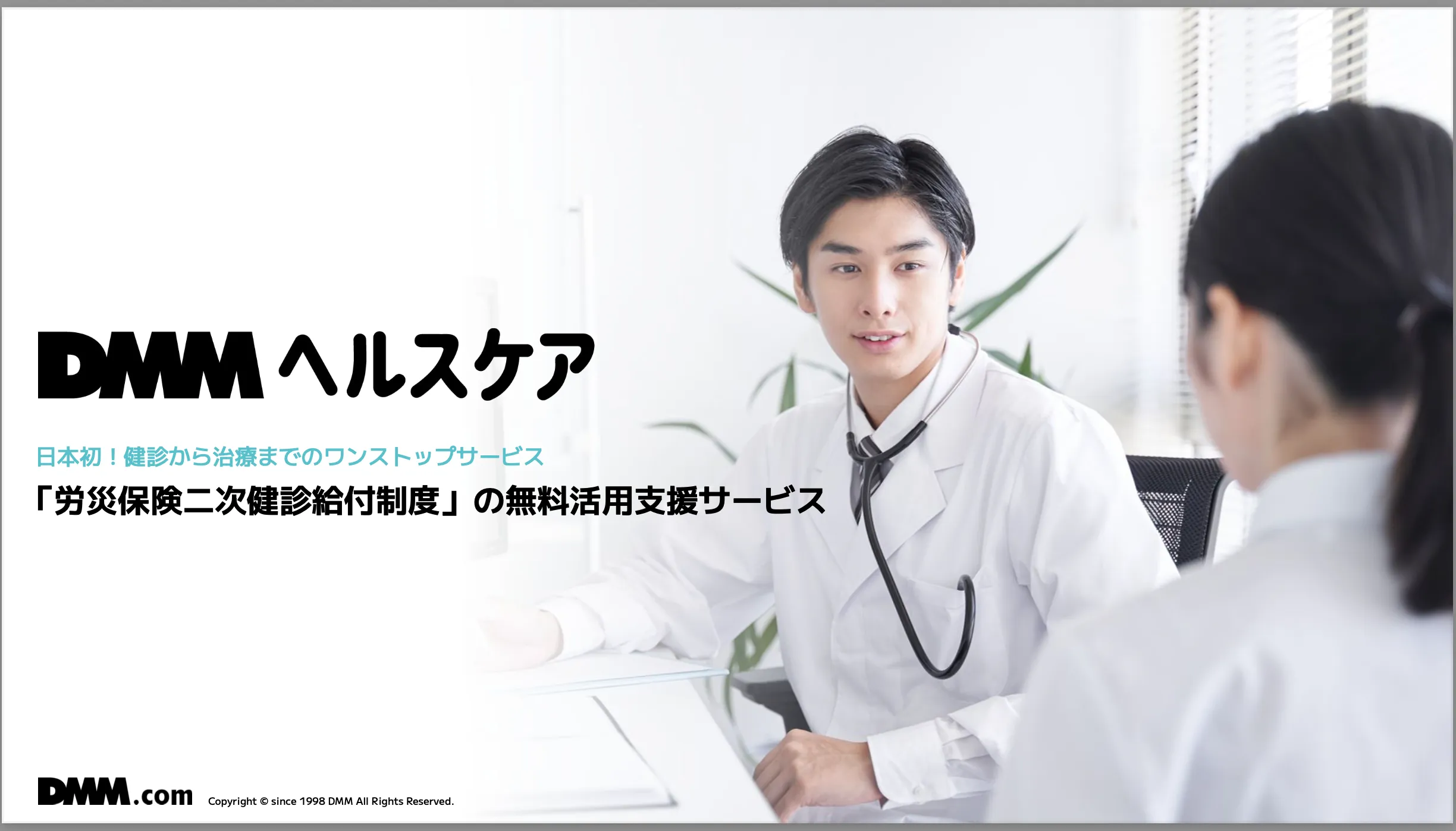 今回、その健康経営をさらに一歩前進させるために選んだのが、DMMが提供する「労災二次健診活用支援サービス」でした。労災保険二次健康診断(労災二次健診)に関する業務をDMMが支援するサービスで、国の給付制度を活用するため費用負担は一切ありません。